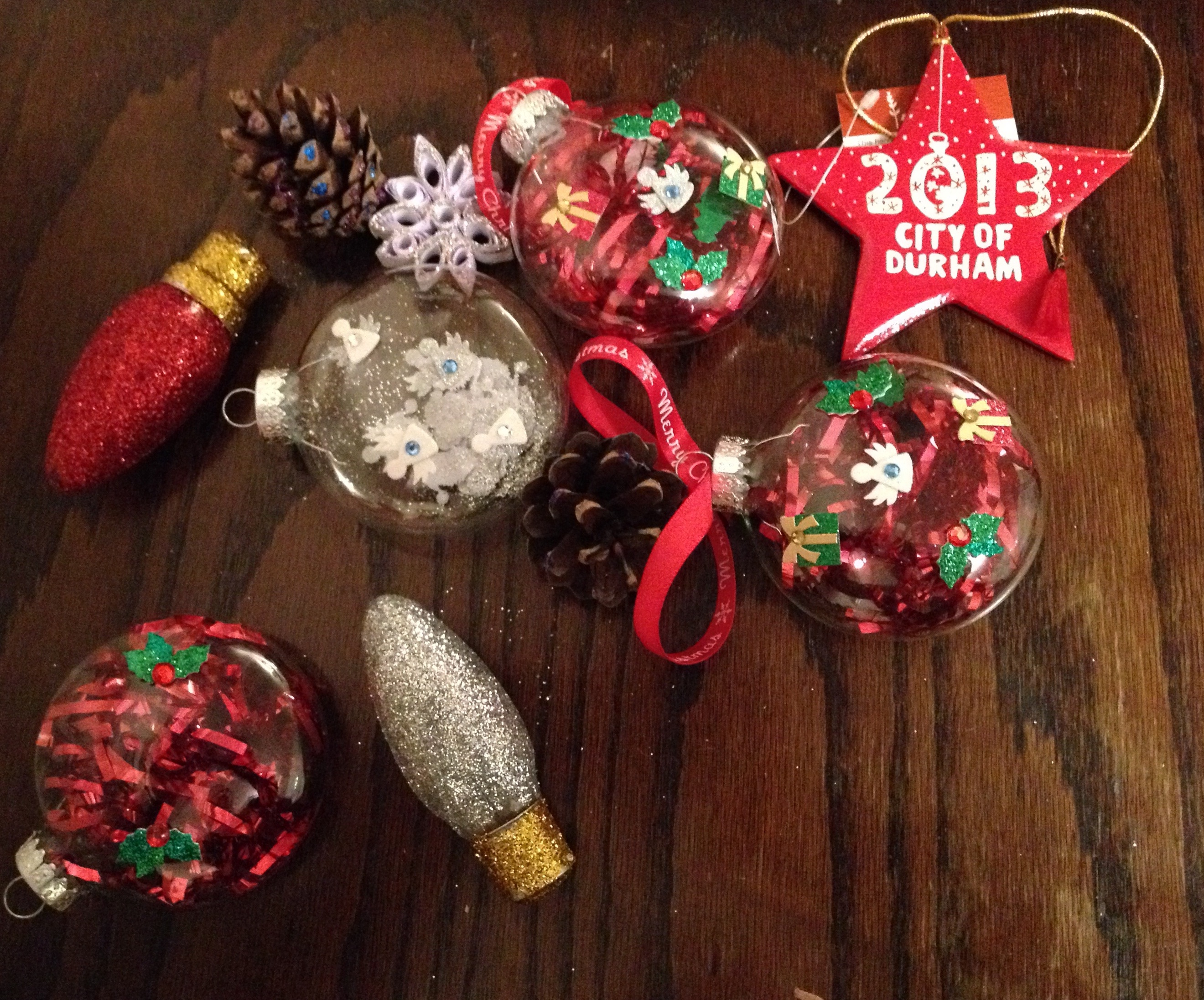 Meg thought the red tinsel for stuffing the bags looked so sweet inside one ornament. Yes, we put some snow and glitter in another. We are having so much fun with these. Thank you very much for the great package. Both kids were sick this weekend so we are having a quiet Monday. We plan on spending some of the day making more ornaments. 😉