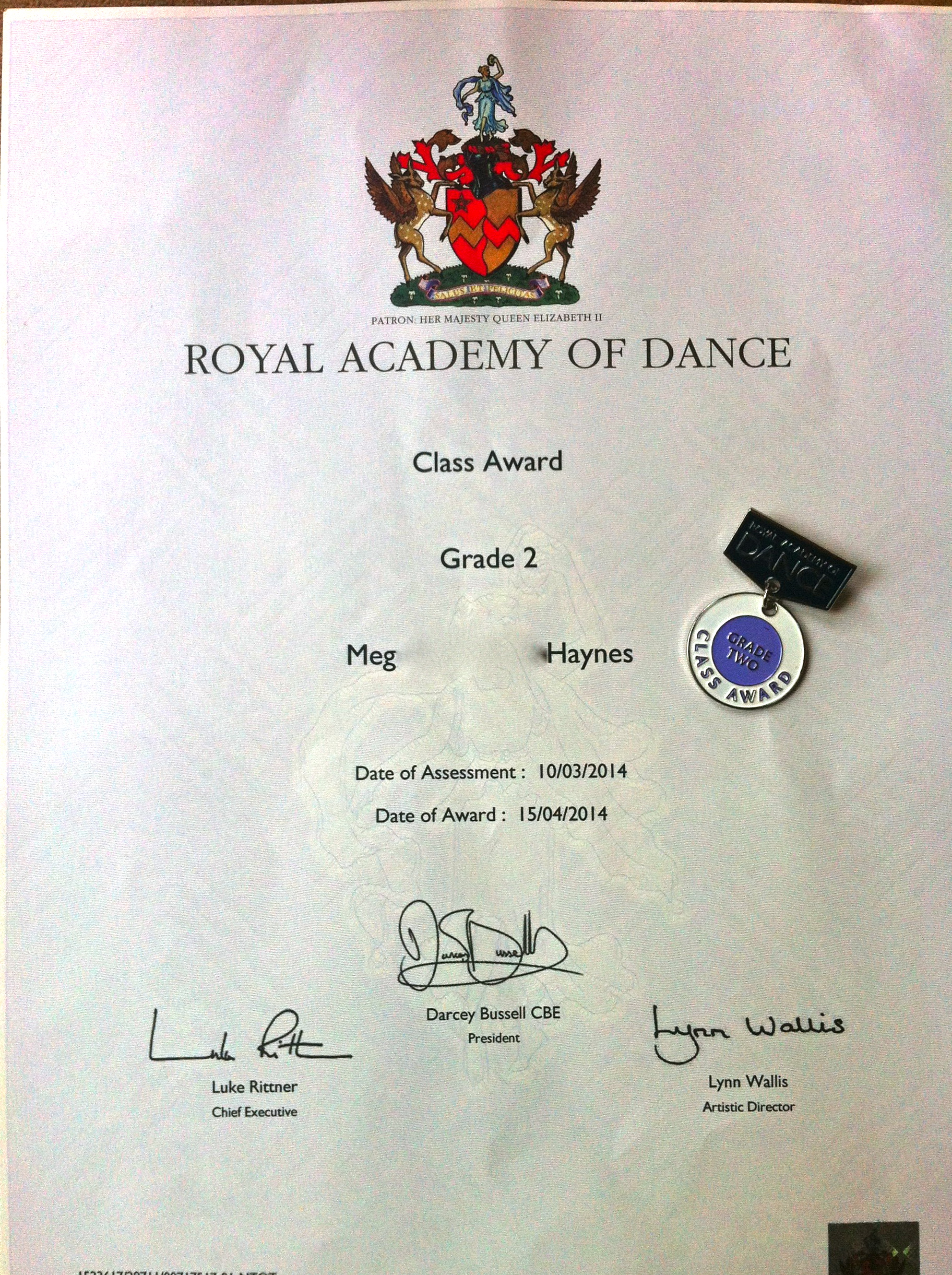 Meg received her marks, certificate and pin last week at ballet.