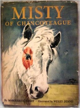 I remember scanning the covers looking for horses. I stopped when a silvery foal stared back at me from a large soft bound book. She had a comical brown patch around one eye and long, lovely eyelashes. I read the title aloud, “Misty of Chin – , Chin, Chin-cottage?” Hum? Undaunted by the island pronunciation I made my purchase and clutched my treasure all the way home.