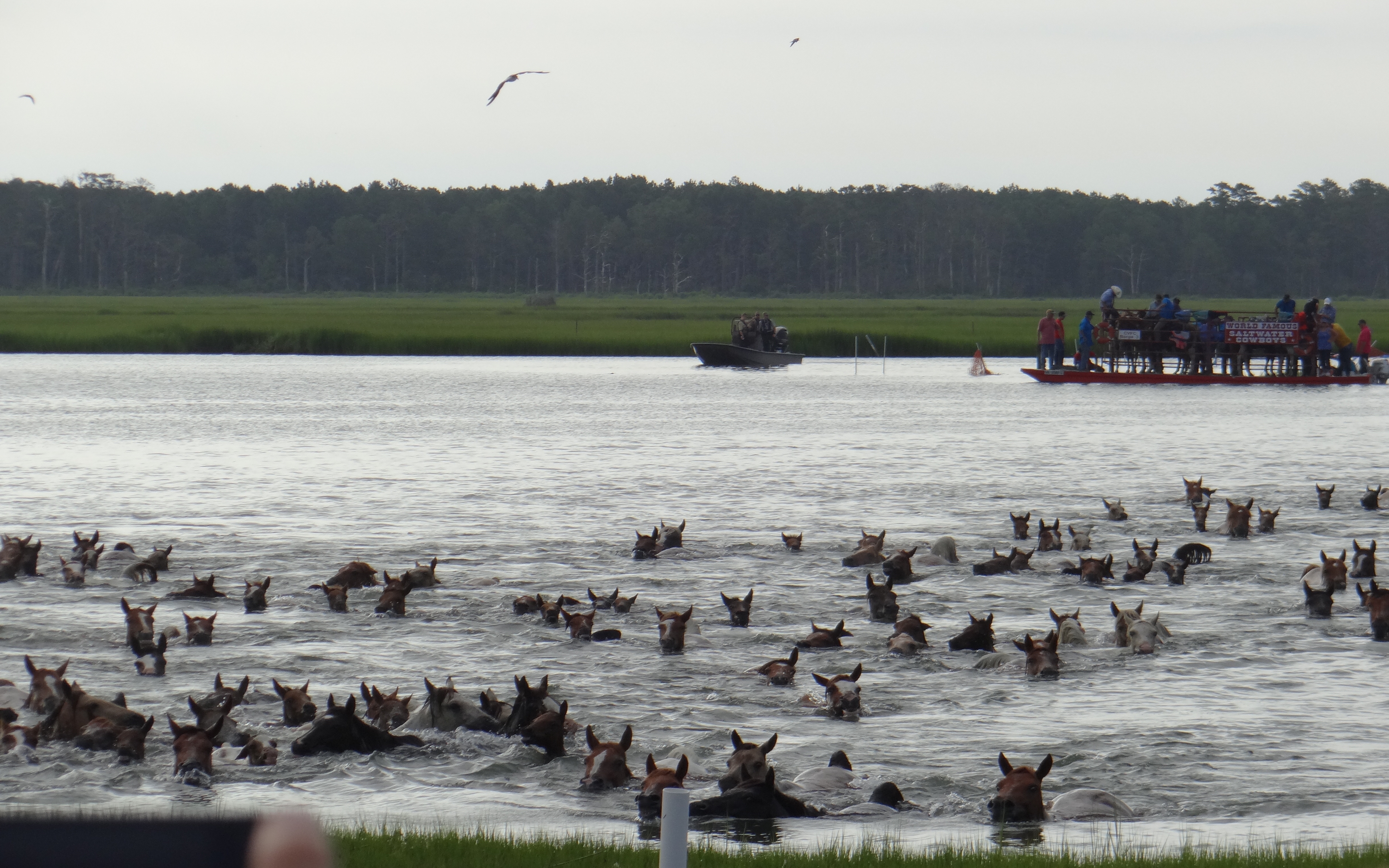 A red smoke flare by the Coast Guard marked the beginning of the swim. We strained forward with binoculars to catch a glimpse of the ponies. Closer they swam, round pony bodies floating well, with eyes, ears and nostrils only visible above the water line.